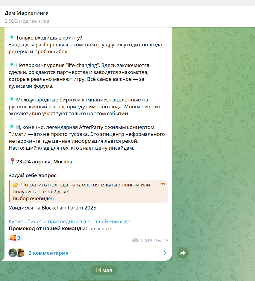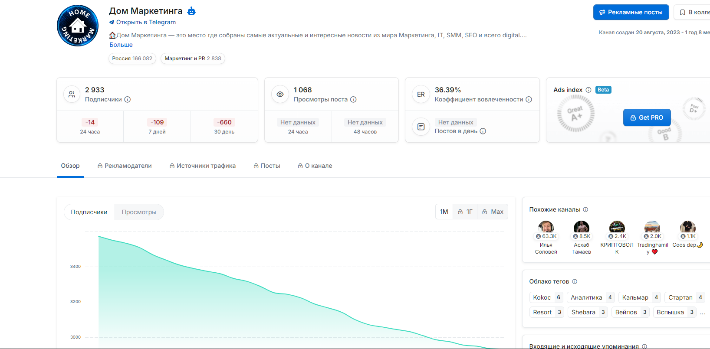 Канал «Дом маркетинга ТГ» насчитывает всего 2993 подписчика. Активность на канале низкая, но комментарии не закрыты. В ТГ канале была явная накрутка трафика, так как посты комментирует всего 5 человек, от канала за месяц отписалось 660 пользователей.