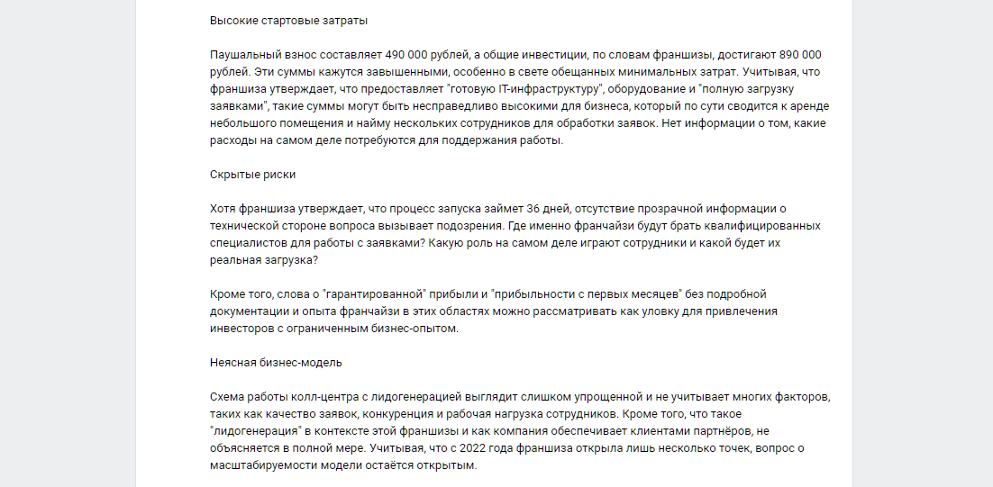 - Компания обещает нереальные доходы и дает невыполнимые обещания. Совершенно непонятно, каким образом фирма будет обеспечивать загрузку нового колл-центра клиентами.