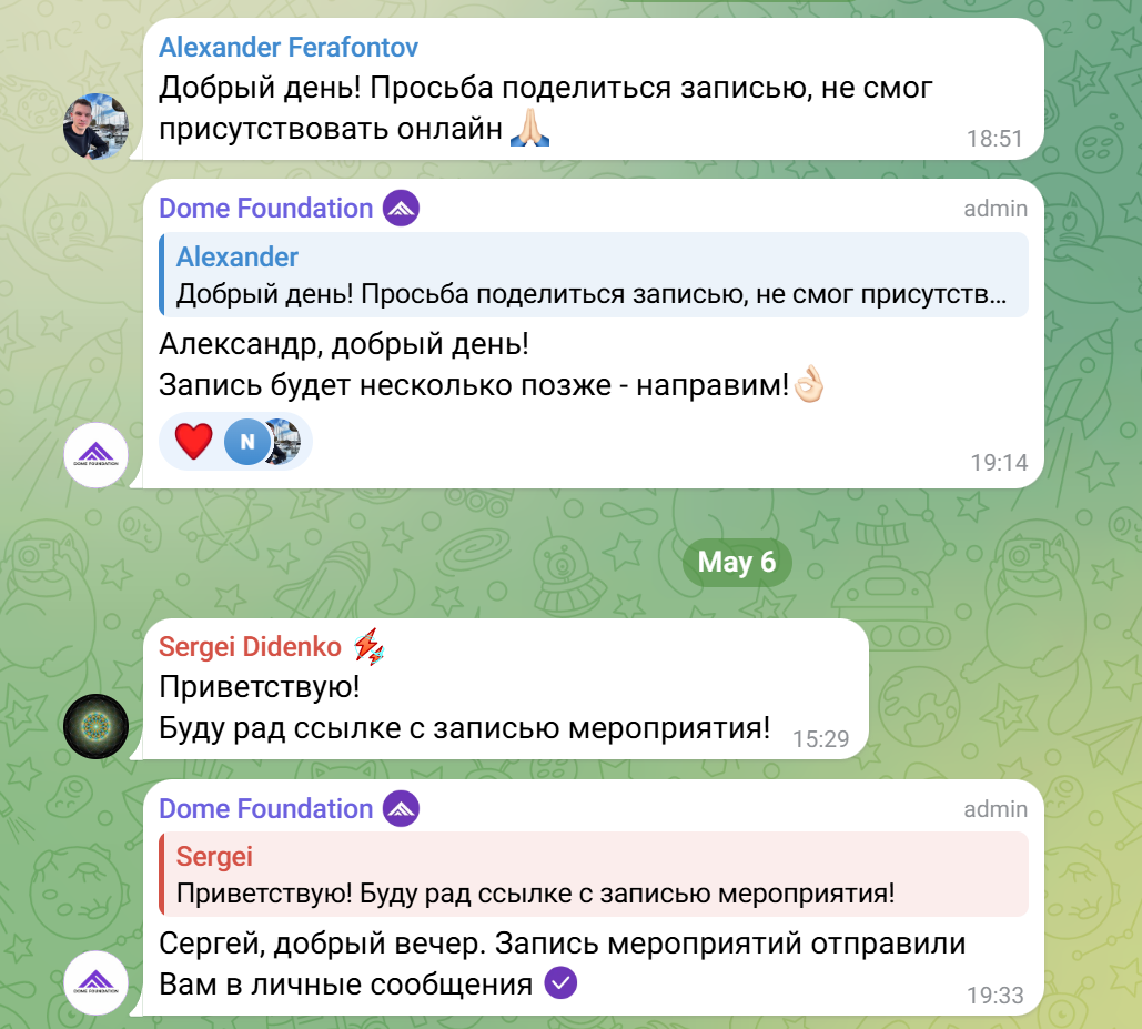 Несмотря на продолжительную работу инвестиционной платформы, отзывов о фонде Dome Foundation пока нет. Единственным источником такой информации может быть канал в Телеграмме, где пользователи задают вопросы и общаются с администратором. Здесь клиенты часто обсуждают возможность записи на мероприятия.