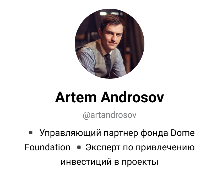 В роли создателя инвестиционной платформы Dome Foundation выступает Артем Андросов. Он позиционирует себя в качестве управляющего партнера компании. Также герой материала заявляет, что является экспертом по привлечению вложений в проекты. Для общения с инвесторами он ведет собственный профиль в Телеграмме под названием Artem Androsov и по ссылке artandrosov.