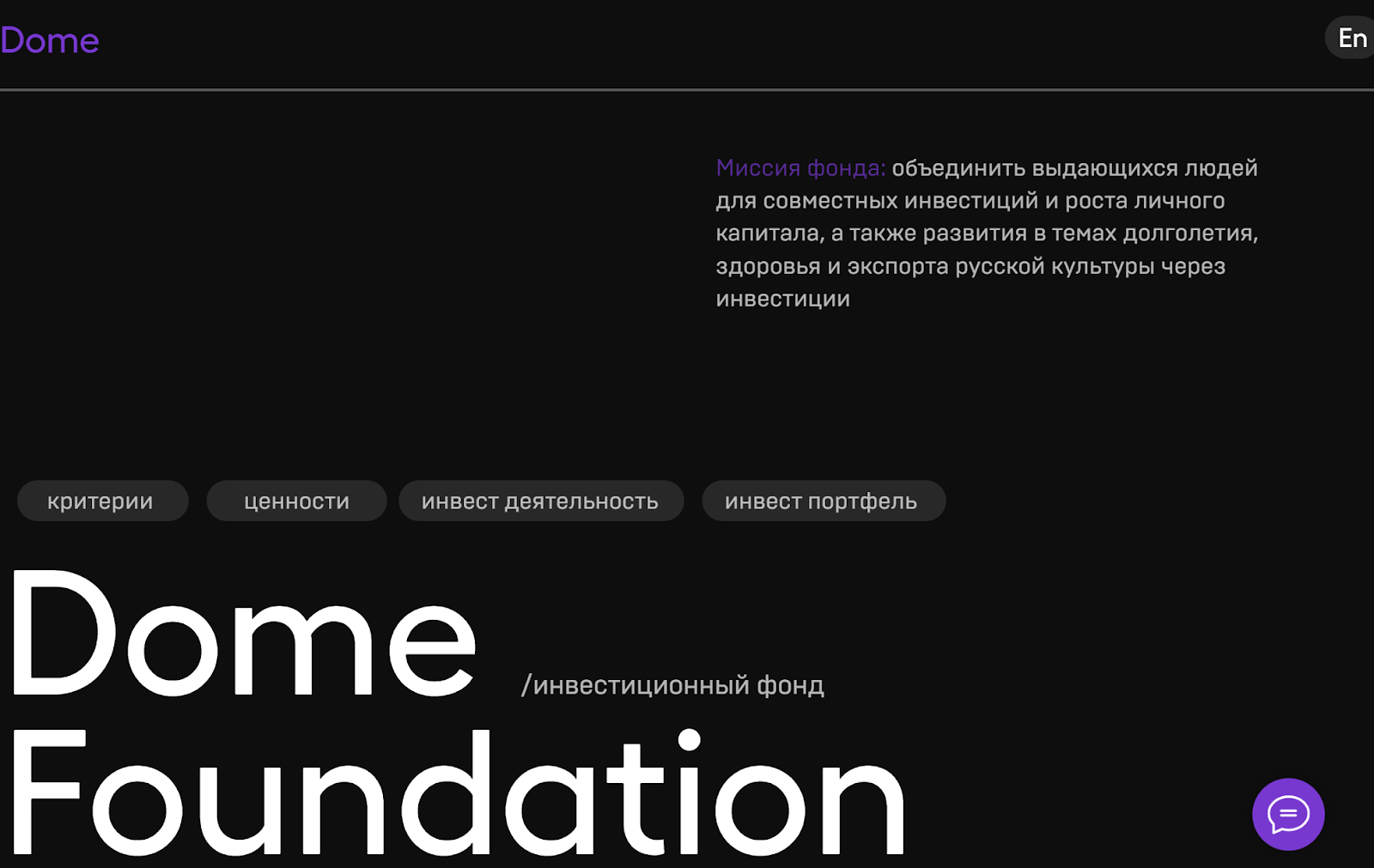 Инвестиционный клуб предоставляет услуги по ссылке Dome Foundation. Сайт представлен в виде одностраничника и выделяется темной темой. В описании говорится, что цель создания состоит в объединении людей для общих вложений и личностного роста. Разработчики заявляют, что инвестиционный клуб Dome Foundation работает с 2022-го и привлек свыше 27 млн USD.