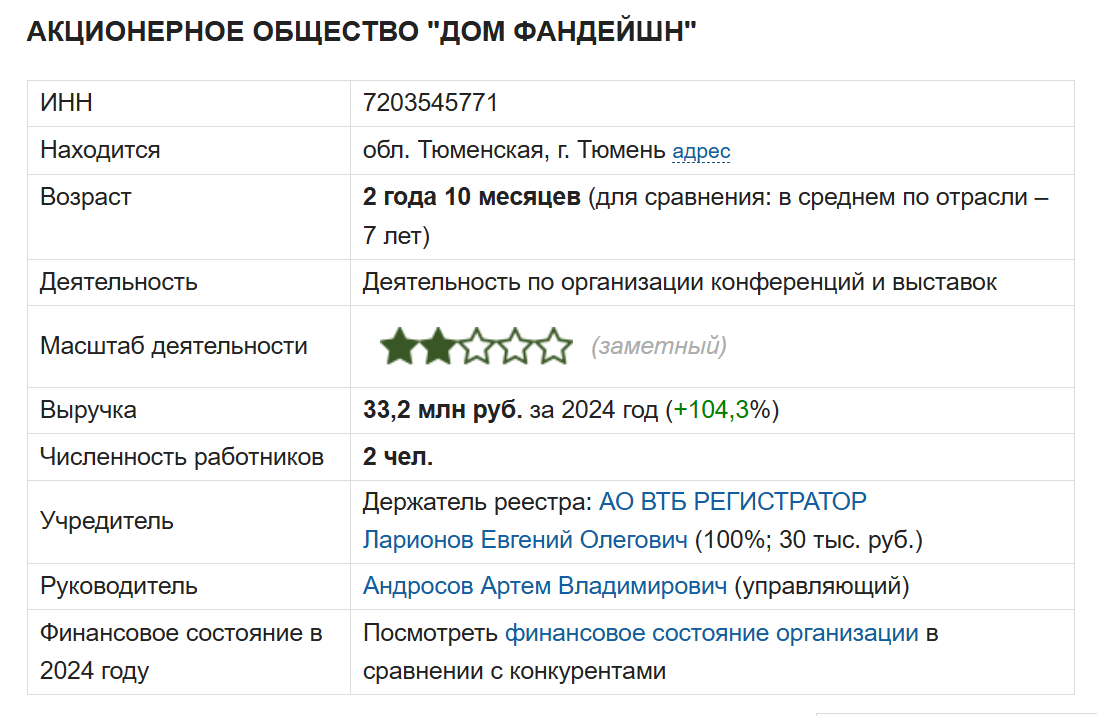 Официальное направление деятельности состоит в организации конференций и выставок. Размер прибыли составляет около 33,2 млн рублей. Количество работников — два человека. В роли учредителя АО Дом Фандейшн выступает АО ВТБ Регистратор Ларионов Е. О. Управляющим является Андросов А.В.