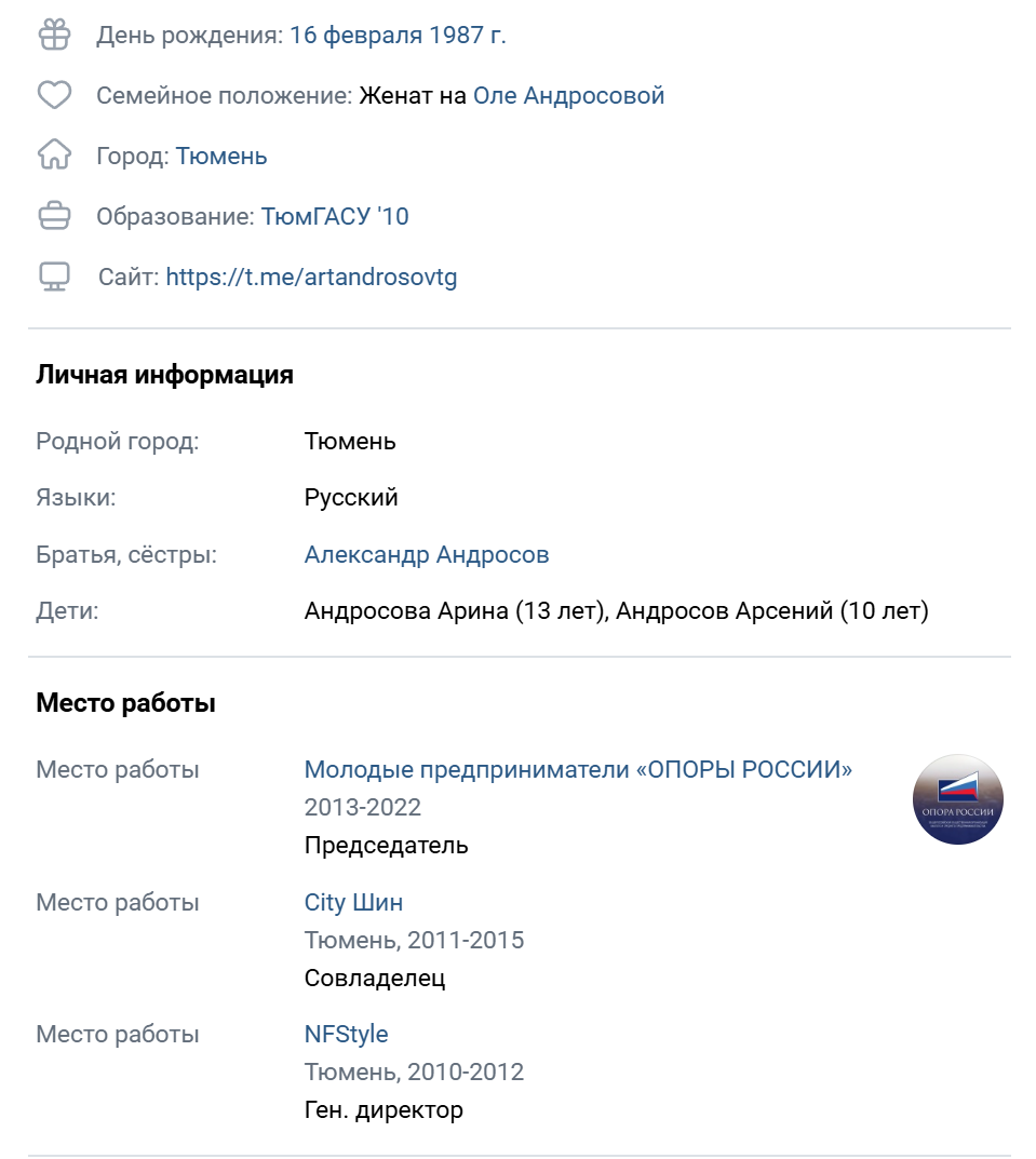 Также Артем Андросов ведет собственный профиль в ВК. Он имеет закрытый формат и достаточно редко наполняется. Здесь сказано, что герой материала учился в Кормиловской СШ №2 и гимназии №16. Впоследствии он получил несколько высших образований по направлениям информационных технологий и архитектурно-строительной сферы.