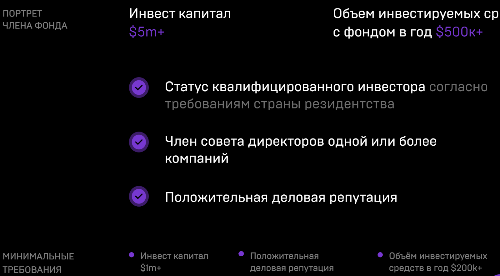 Для получения доступа к инвестированию необходимо учитывать минимальные условия. Клиент должен иметь инвестиционный капитал от 1 млн USD и выше. Обязательным условием является положительная репутация и объем ежегодных вложений от 200 тыс. USD.