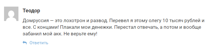 Наша команда нашла несколько отзывов о мошеннике Олег domrussia: все они отрицательные. Комментатор по имени Теодор сообщил, что потерял 10 тыс. руб., а когда попытался написать Олегу в Telegram, тот внес его в черный список.