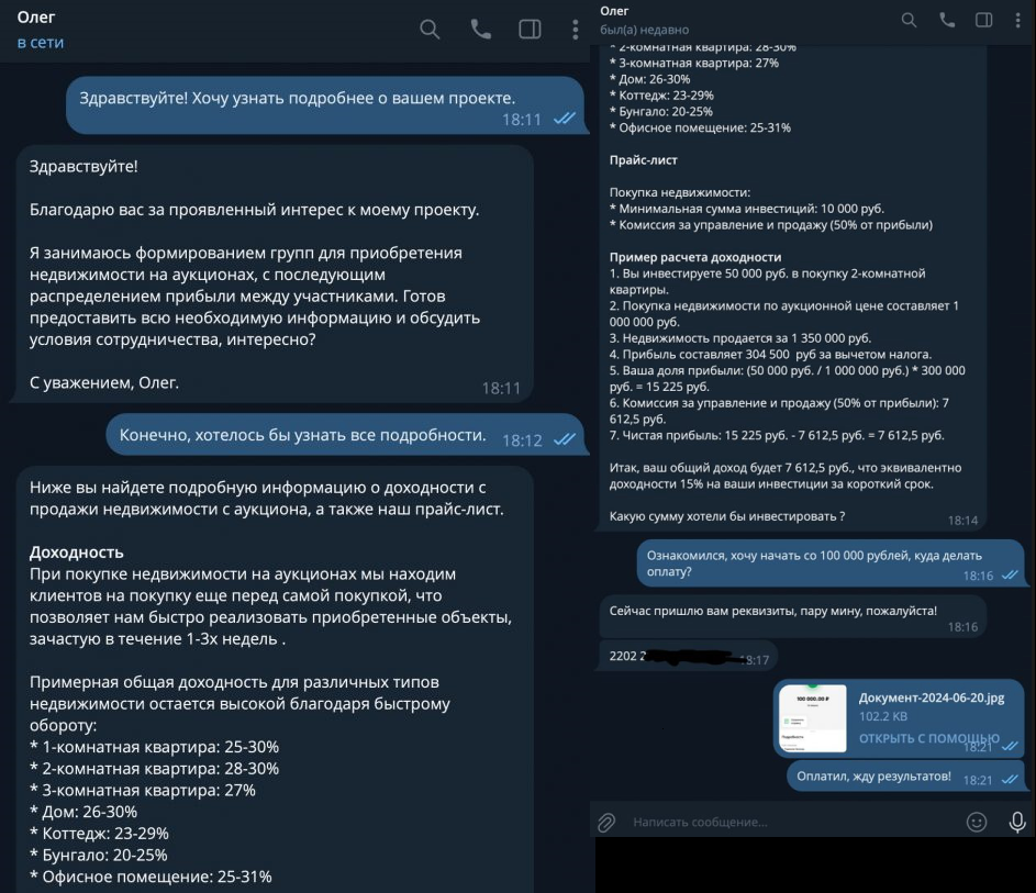 Своих жертв Олег находит в городских чатах. В основном это люди, оказавшиеся в сложной финансовой ситуации. Он предлагает им вложить деньги в недвижимость — минимальная сумма инвестиций составляет 10 тыс. руб. За это он обещает доход 20–27% за очень короткий срок.