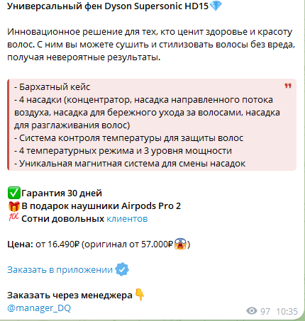 Еще в одном посте админы рекламируют фен Dyson за 16 тыс. руб. При заказе этого товара аферисты обещают прислать в подарок еще и наушники. Это выглядит подозрительно: легальные магазины обычно не разбрасываются подобными «презентами», чтобы не уйти в убыток. Да и цена выглядит слишком низкой.Почти каждый пост содержит ссылку на телеграм-группу с отзывами. Однако владельцы «магазина» создали ее сами, поэтому все написанное там не внушает доверия. Один из пользователей называет колонки «бомбой» за высокое качество звука и благодарит команду магазина «за гибкость в обслуживании».