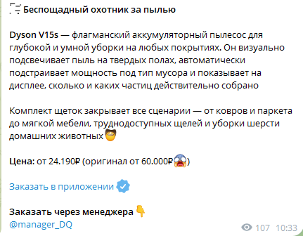 В одном из постов автор предлагает покупателям реплику пылесоса Dyson за 24 тыс. рублей. Чтобы сделать заказ, клиент должен написать менеджеру в личные сообщения в Телеграм. Если продавец окажется мошенником, он может дать ему реквизиты дропа для перевода денег, а затем удалить переписку и отрицать факт «сотрудничества».