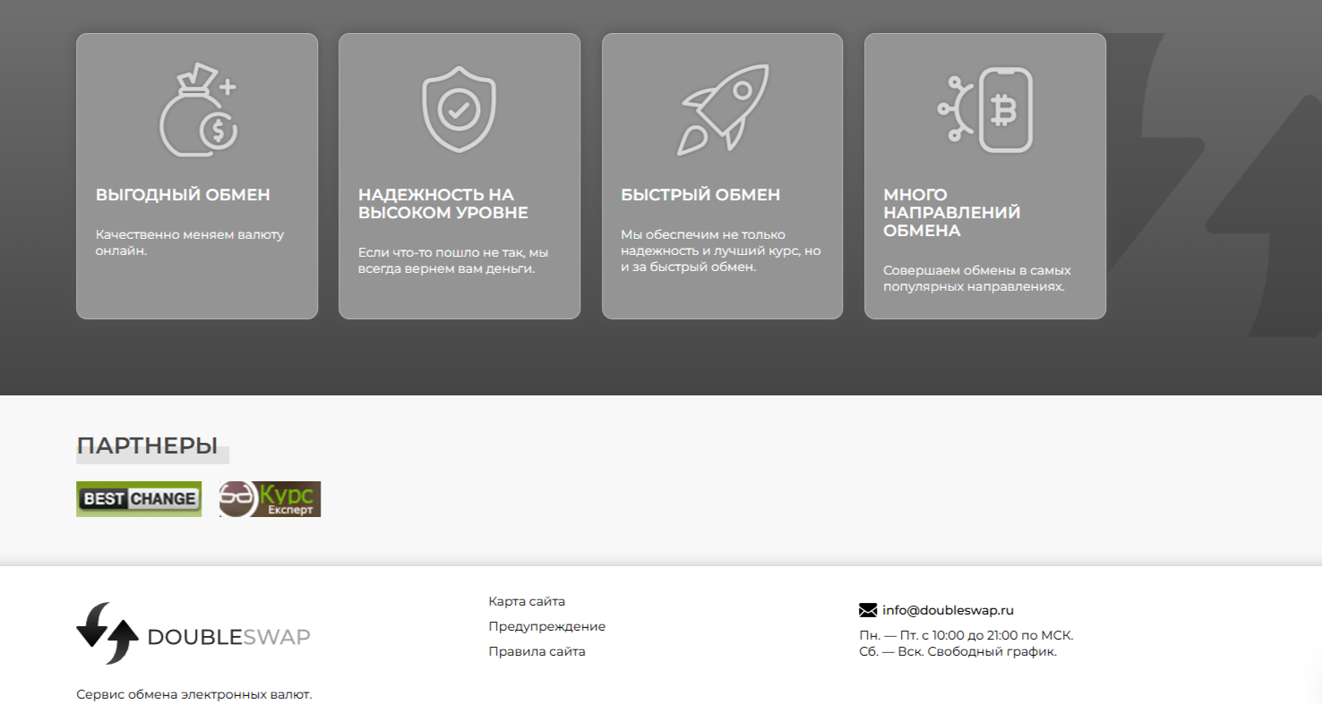 DoubleSwap – обменный пункт с неоднозначной репутацией. Его условным плюсом можно назвать выгодный и быстрый обмен. Перечень минусов читайте ниже: