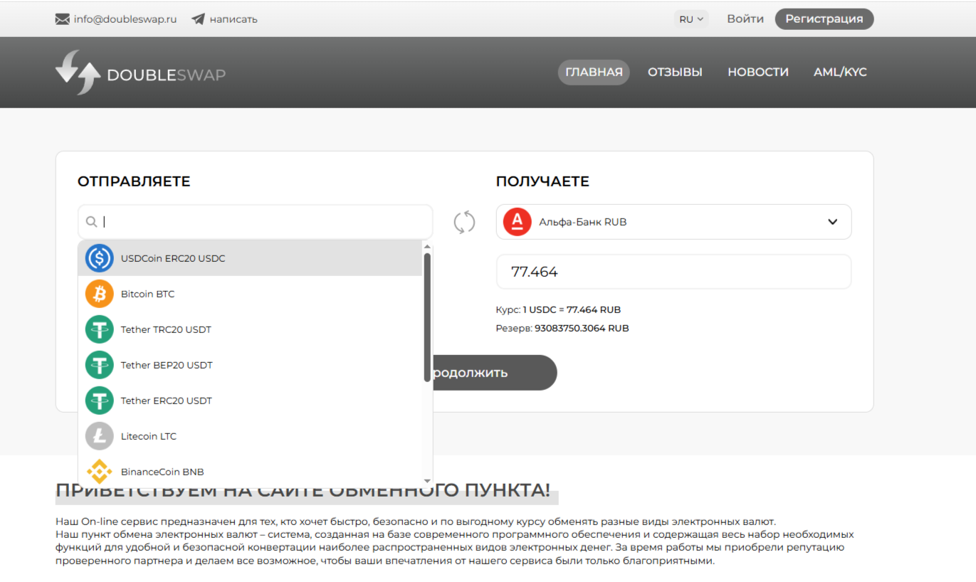 Основная деятельность платформы для обмена заключается в финансовых операциях с криптой. В обменном пункте Double Swap пользователи могут выгодно конвертировать Ripple, Bitcoin, Monero, Dai, Tether, Litecoin, BinanceCoin и ряд других токенов в рубли. Платформа осуществляет обмен 14 электронных монет, особо популярных у целевой аудитории. Получить за цифровые активы рубли можно на карты: