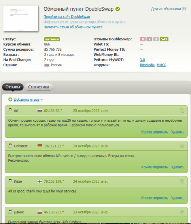 В процессе проверки различных веб-сайтов в интернете нами были найдены позитивные комментарии о платформе для обмена. Размещены благоприятные отзывы на самом сайте doubleswap ru, а также на ресурсах мониторингов-партнеров. В этих отзывах пользователи упоминают быстрый обмен. Однако практически ничего не пишут о выгодных курсах.
