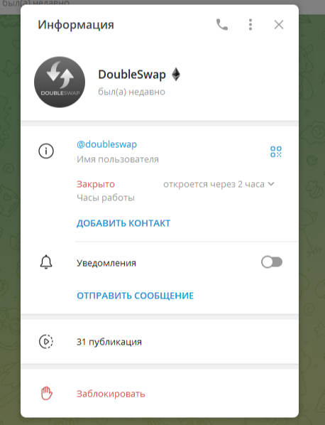 Криптовалютный обменник «ДаблСвап» обслуживает целевую аудиторию с 10:00 до 21:00 МСК с понедельника по пятницу. В субботу и воскресенье сервис работает по свободному графику. В рабочее время поддержкой клиентов занимается профессиональный саппорт. Связаться с ним можно в телеграм-канале DoubleSwap, в письме на электронную почту info doubleswap ru или во внутреннем чате на веб-сайте.