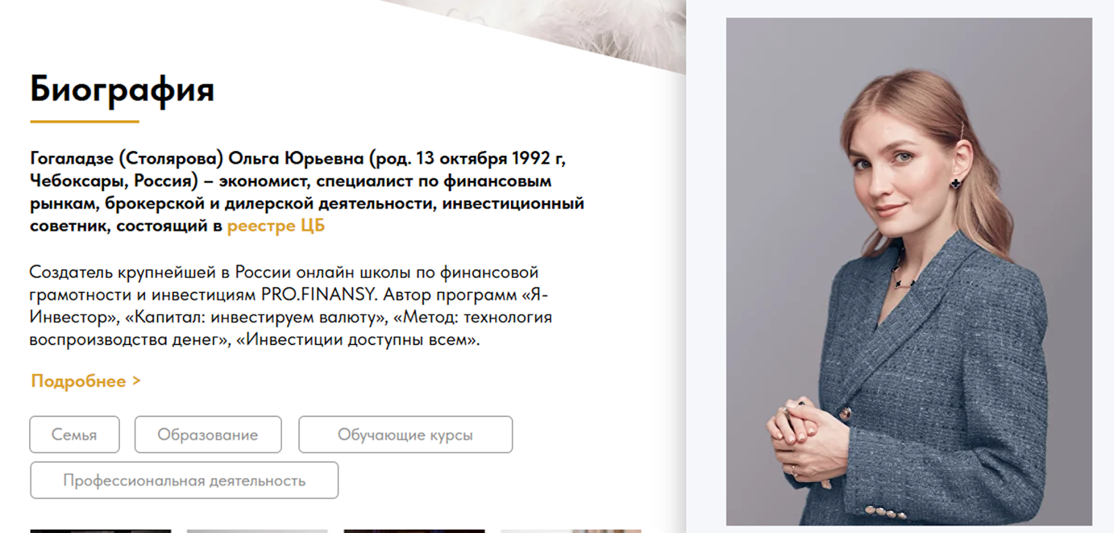 Женщина ведет свой финансовый блог в Телеграме и Инстаграме, где рассказывает о своей жизни и делится полезным для инвесторов контентом. Очень известна и ее онлайн-школа Pro finansy. На ней представлено множество тематических курсов и интенсивов. Есть и бесплатные инфопродукты.