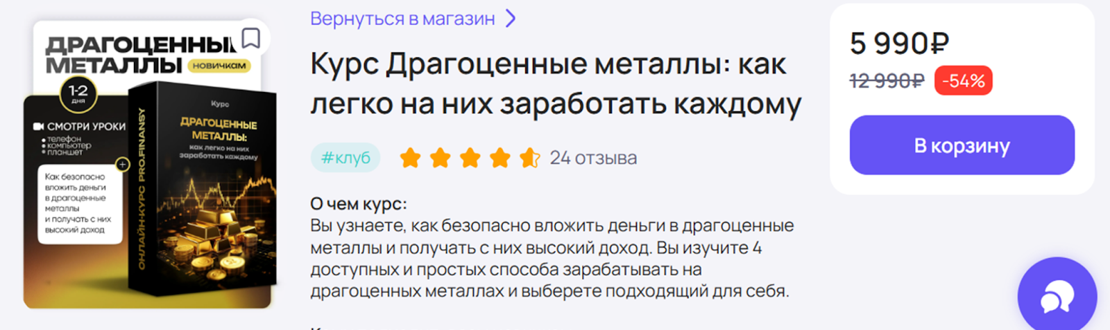 Курс «Драгоценные металлы как легко на них заработать каждому» будет актуален для новичков. которые абсолютно ничего не смыслят в данной области. Но при изучении программы мы можем сделать вывод, что данная информация есть в открытом доступе, поэтому платить полную цену за данное обучение не советуем. К тому же, независимых отзывов на данный инфопродукт нет, особым спросом он не пользуется.