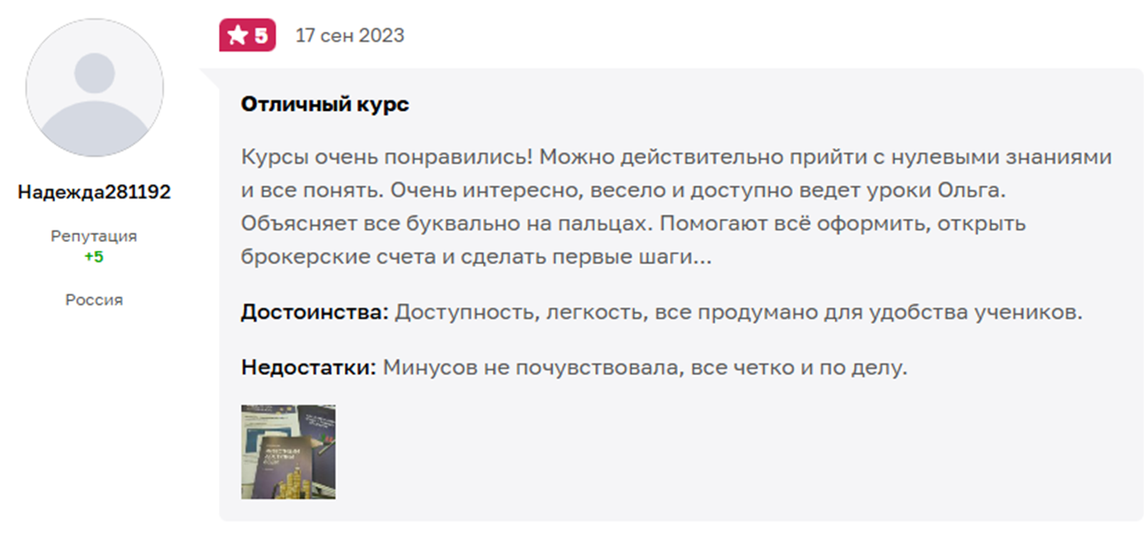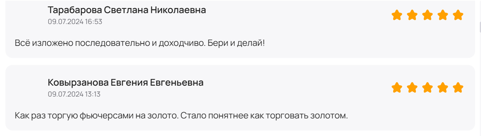 На курс «Драгоценные металлы как легко на них заработать каждому» отзывы есть исключительно на сайте школы Profinansy. Естественно оценка у обучения очень высокая и ученики довольны содержанием. Но подлинность подобных мнений вызывает серьезные сомнения.