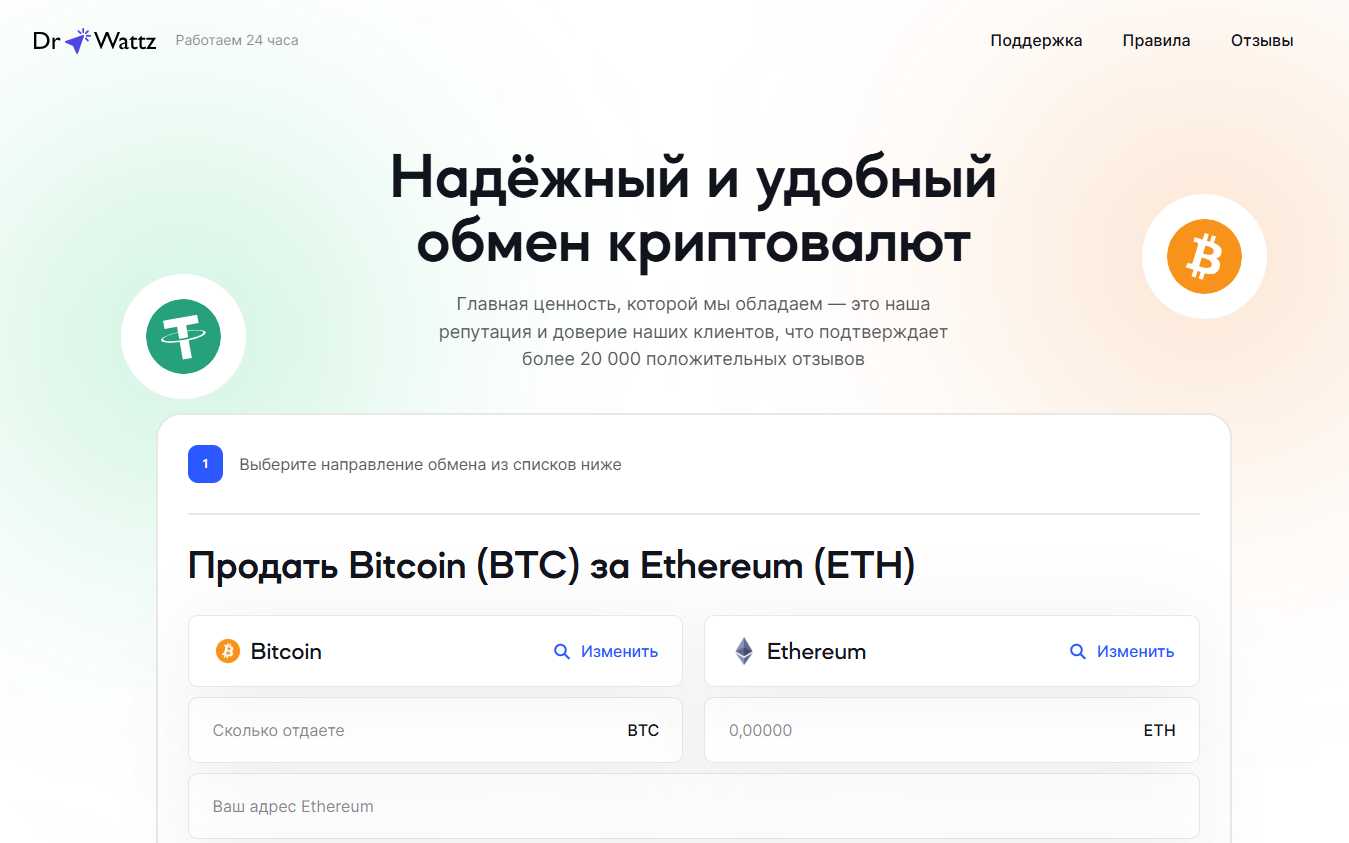 Обменник позиционируется как автоматический круглосуточный сервис для быстрого и надежного обмена валют. По словам руководства, их главная ценность – это их высокая репутация и доверие их пользователей. Якобы качество услуг обменника Drwattz Com подтверждает наличие более 20 тысяч положительных отзывов на сторонних ресурсах.На главной странице проекта пользователей сразу встречает окно, чтобы начать обмен. Для отдачи и получения тут доступно 25 криптовалют.