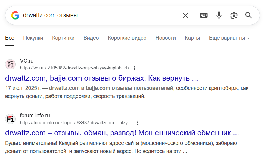 Единственная статья, где упоминается источник, была написана именно в день обновления домена. Причем в этой публикации содержится негативный отзыв о работе ресурса Drwattz Com, хотя авторы заявляют, что они функционируют с 2016 года и имеют большую базу довольных клиентов.