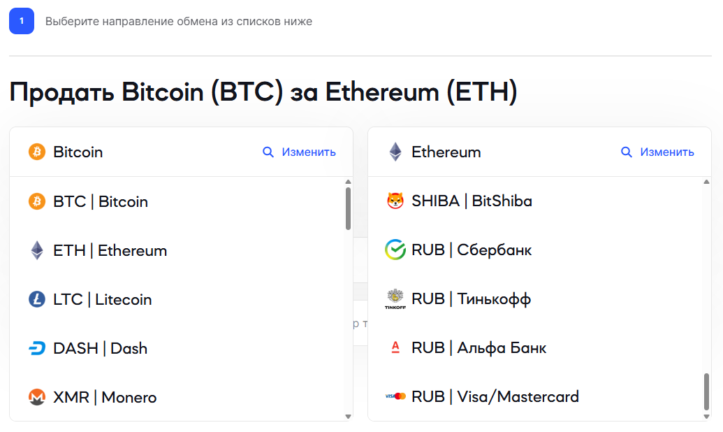 Плюс, в обоих списках есть и российские рубли, которые можно отдать или получить на счет трех банков РФ. Странно, что другие фиатные валюты тут не указываются. Похоже, обменник сотрудничаем только с РФ. На это намекает и то, что оригинальный язык интерфейса ресурса – русский.