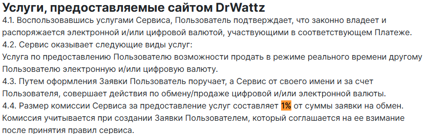 В этом документе мы нашли данные, что площадка Drwattz Com берет комиссию 1% от обменной суммы. Еще владельцы предупреждают, что не дают однозначных гарантий, что потребности клиента будут удовлетворены.
