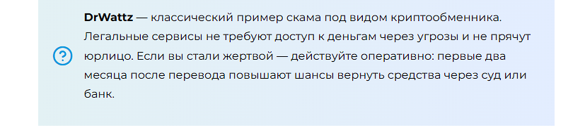 В независимых источниках обменник Drwattz почти не упоминается. Всё, что можно найти – название данного сервиса в scam списках. Сразу несколько ресурсов причислили его к мошенникам.