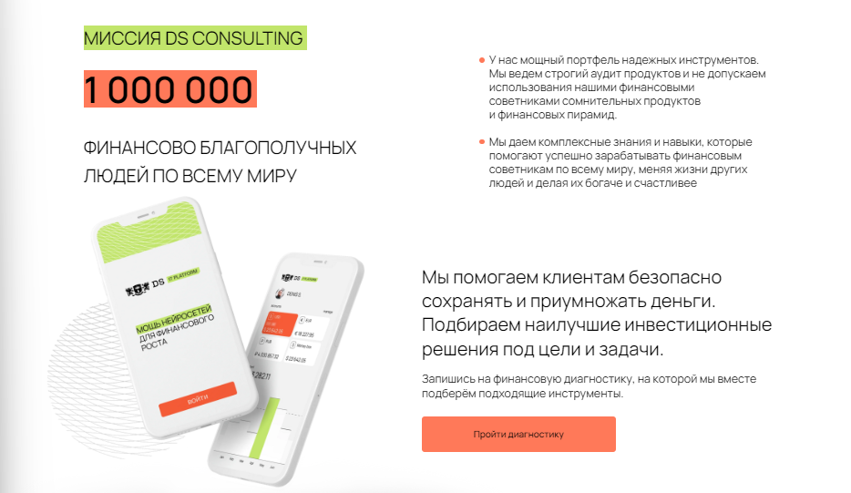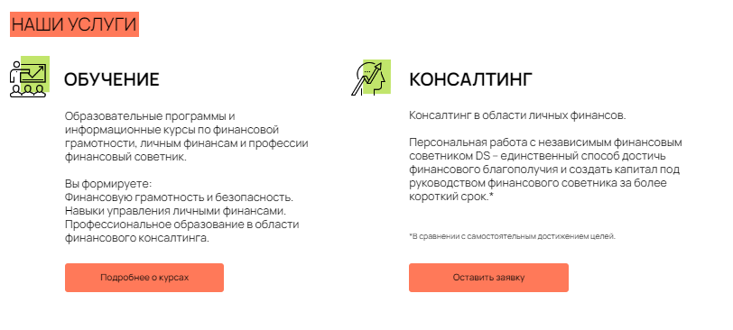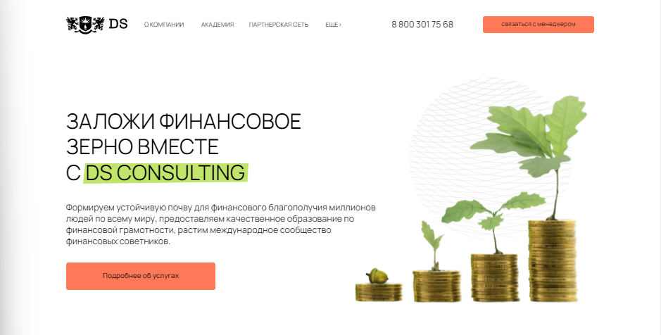 DS Consulting — онлайн школа, продающая курсы по финансовой грамотности. Слоган проекта: “Заложи финансовое зерно”. Миссией компании является обучение как можно большего числа людей, с целью повышения их денежного благополучия, предоставляя им качественные услуги и знания.