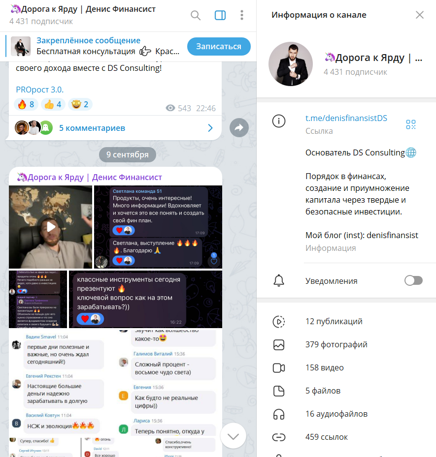 У Дениса есть каналы в телеграме, ютубе и инстраграме. По части наполнения — обычная лента с новостями о проекте для привлечения аудитории и создания позитивного впечатления. Аудитория канала составляет 4 431 подписчик, но просмотры совсем низкие. Охват держится в районе 200-300 глаз на пост. Встречаются комментарии с уже мёртвых аккаунтов, а это явный признак накрутки.