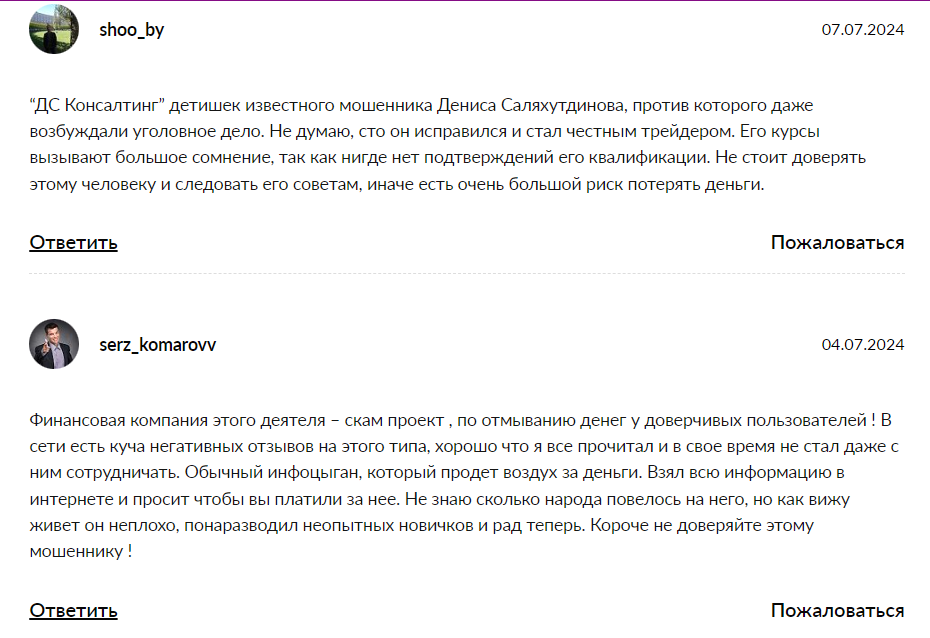 Отзывы на ds consulting в основном отрицательные. Пользователи уверены в том, что это всё развод и компания вовсе не то, за что себя выдаёт. Кто-то упоминает о ситуации, где полиция возбудила уголовное дело на Дениса. Доверия к курсам нет, так как нет подтверждённой квалификации.