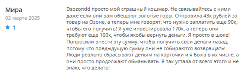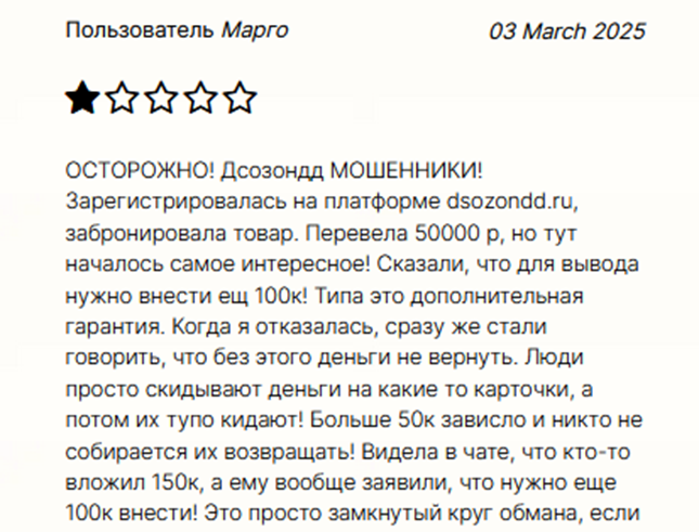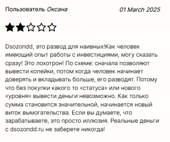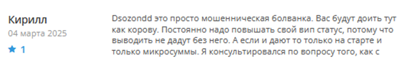 В сети есть множество отрицательных отзывов о Dsozondd. Клиенты компании говорят о невозможности получения денег, постоянных требованиях новых депозитов. При этом суммы большие – от 100 тысяч рублей и выше. Такие вклады называют гарантийными, но вывести их пользователи не смогут. Администрация находит разные причины для отмены заявок, блокировки счетов.