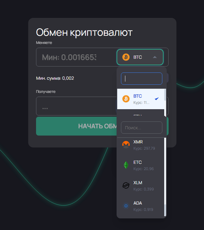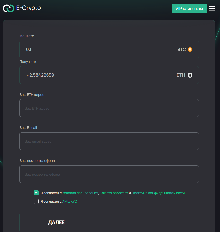 Выбрав обменную пару, клиенту необходимо нажать «Начать обмен». Дальше ему нужно будет заполнить небольшую форму, где указывает адрес кошелька получаемой валюты, электронная почта и номер телефона. Плюс, нужно поставить соглашение со всеми правилами и условиями.