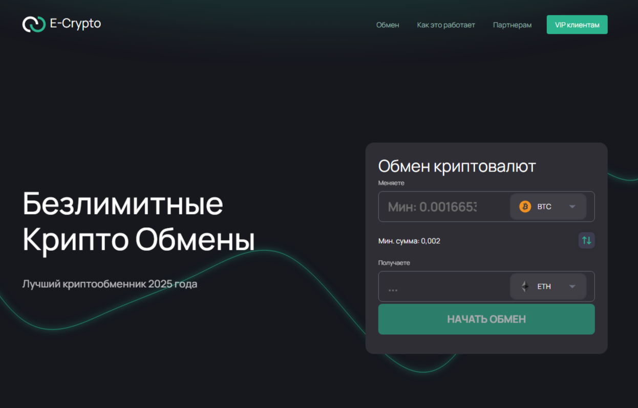 При проверке криптовалютной биржи «Е Крипто» мы сразу обратили внимание на примитивный и непрезентабельный сайт. Пользователей тут встречает заголовок, что данный обменник является лучшим за 2025 год. Особо информативных разделов тут нет. Из контактной информации авторы предоставляют только ссылку на телеграм-аккаунт менеджера @ E Crypto Manager.