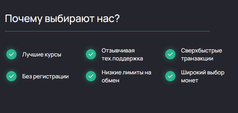 Мы заметили, что авторы очень расхваливают свой проект. Так, в очередной раз они привели список своих преимуществ, где указывается: широкий выбор монет, лучшие курсы и так далее. Очевидно, что это пишется только для привлечения внимания, причем на всех шаблонных площадках.