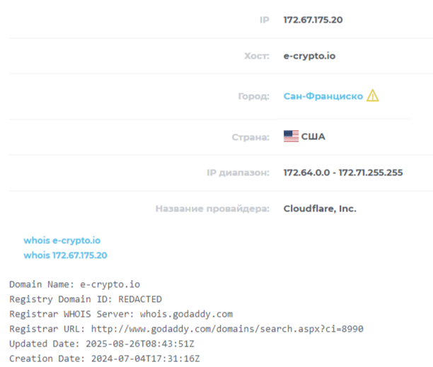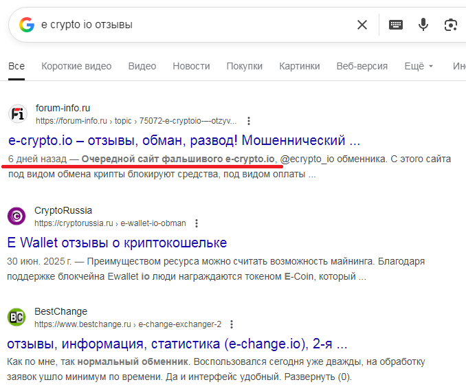 Также мы решили изучить подробности о данном источнике на просторах интернет. Здесь мы увидели, что о нем тут речи практически нет. Единственная статья, где засветился обменник E Crypto Io содержит негативный отзыв и была написана 6 дней назад. Похоже, под этим названием сайт появился в конце августа 2025 когда, когда у домена было обновление.