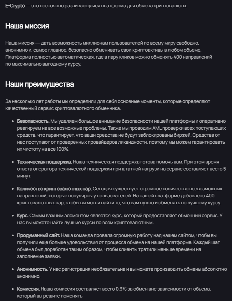 Стоит заметить, что здесь была вкладка «О нас». По словам руководства, миссия проекта E Crypto Io заключается в том, чтобы дать возможность всем жителям планеты комфортно, анонимно, легко и безопасно обменивать криптовалютные активы. Для этого со своей стороны они представляют: