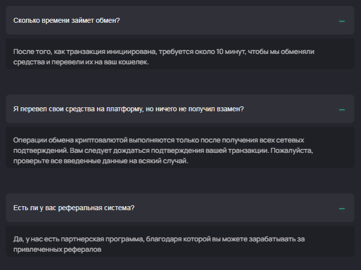 Авторы указывают, что обработка заявки занимает 10 минут. Помимо обмена здесь еще предлагают зарабатывать на реферальной системе. Подробностей о размерах заработка и условиях участия нет.