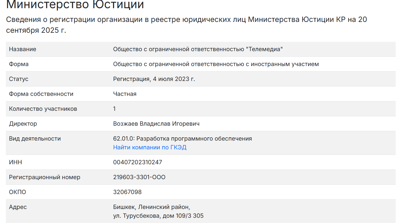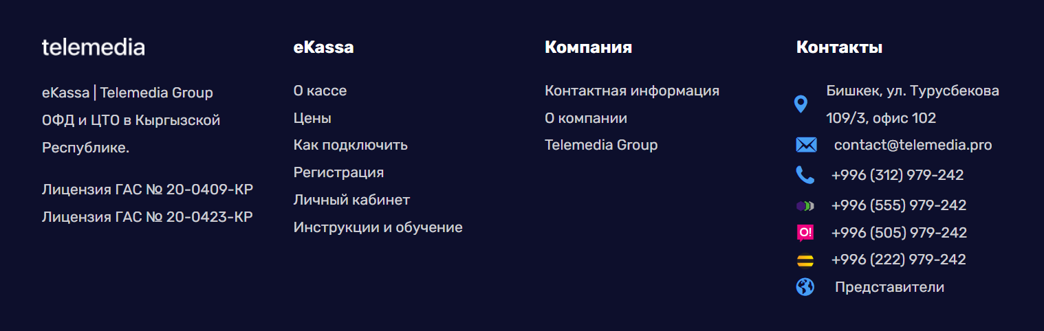 Согласно указанным данным, сервис управляется Telemedia Group, у которой есть две лицензии ГАС – № 20-0409-КР и № 20-0423-КР. Это значит, что у организации присутствует разрешение на предоставление телекоммуникационных услуг.. У проекта «Е Касса» есть штаб-квартира в Кыргызстане, Бишкеке – улица Турусбекова, 109/3.