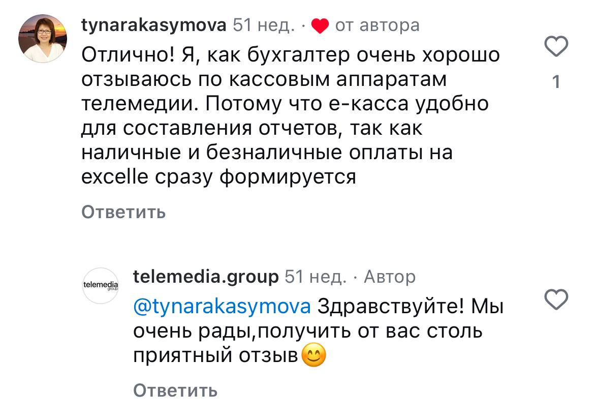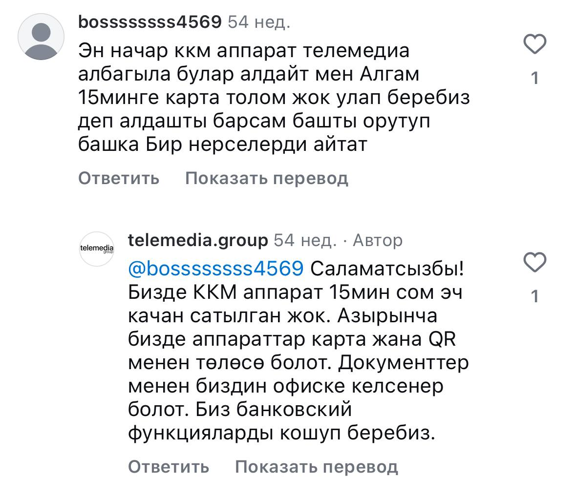 Тем не менее в Instagram проекта можно найти и негатив. Так, один из юзеров на кыргызском языке пишет, что потратил на терминал ⃀15,000, но аппарат не принимает карты, хотя изначально такая возможность якобы была заявлена. Примечательно, что администрация E Kassa не игнорирует отзыв и отвечает на него. Сотрудники компании заявили, что никогда не продавали ККМ по такой цене, предлагая пользователю прийти в офис и уточнить все лично.
