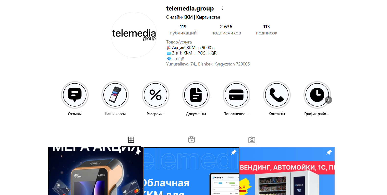 У кассы есть бот в Telegram – @tmgkg_bot, который описан как «центр оповещения», попытка запуска ни к чему не приводит. Вероятно, он сам присылает уведомления пользователям E Kassa. В «Инстаграм» на страницу Telemedia group подписано 2 636 человек на конец ноября 2025. В основном посты касаются оповещений об акциях и нововведениях.