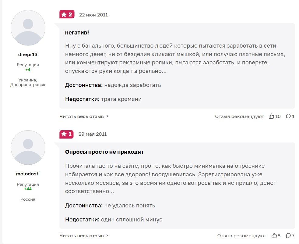 Другим же опросник не нравится. Люди жалуются, что опросов очень мало, заработать не получается. Некоторые клиенты утверждают, что платформа сливает номера телефонов.