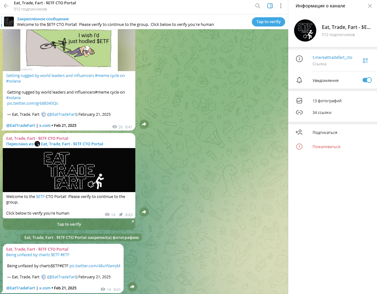 Официальный Telegram-канал Eat Trade Fart насчитывает всего 511 подписчиков, а последние сообщения ограничиваются техническими инструкциями по покупке токена. Администратор – Locohablapoco, он же Loco Habla Poco.