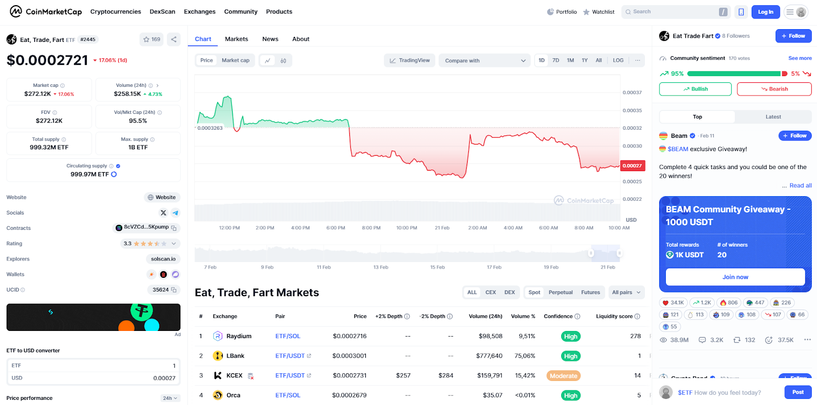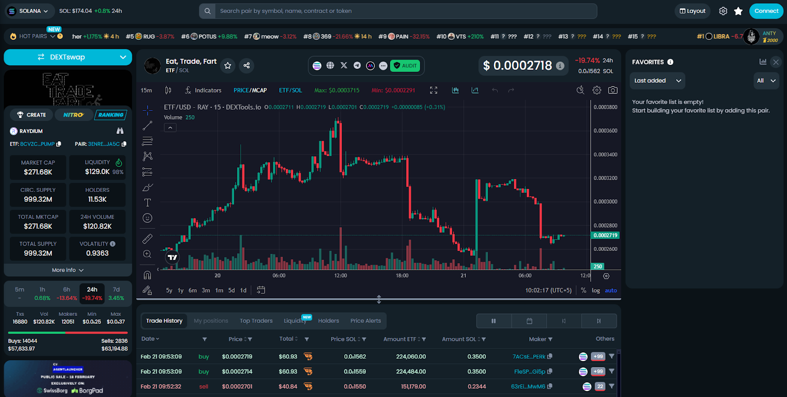 Eat Trade Fart — мемкоин, запущенный на блокчейне Solana. Токен быстро потерял ценность и продолжает дешеветь. Курс ETF составляет $ 0.00028781, что на 95% ниже пиковых значений.