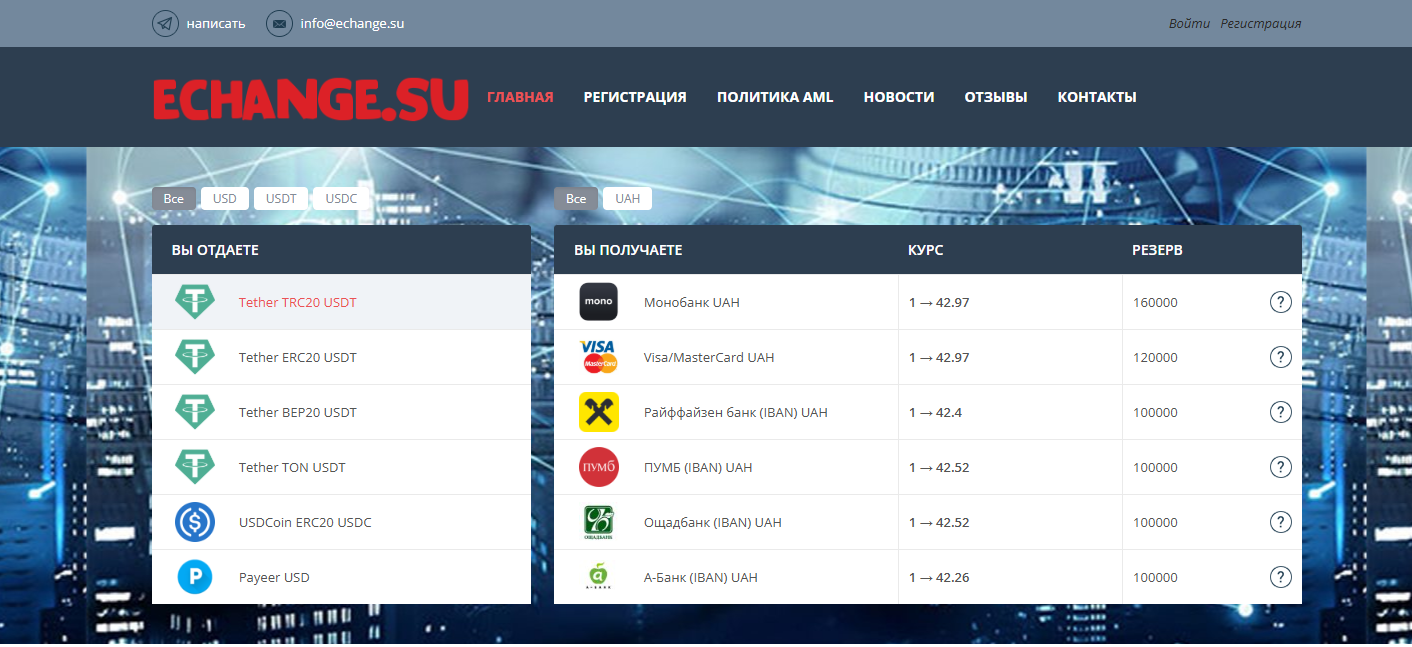 Echange.su работает с основными криптовалютами и обычными деньгами. Выбор не огромный, но все нужное есть. Можно менять USDT в сетях TRC20, ERC20, BEP20 и TON. Есть USDC, но только в ERC20. Плюс классика – Bitcoin и Ethereum. Поддерживают доллары, евро и гривны. Можно вывести на банковские счета в Украине или Европе через IBAN. Работают с Payeer (в долларах), AdvCash и Perfect Money. Не густо, но для большинства задач хватает. USDT – самое популярное направление, что неудивительно, ведь это главная валюта для обменов. Если у вас что-то менее распространенное, возможно, придется поискать другой сервис. Список валют обновляется редко. За все время новых монет не добавили, и это минус для тех, кто работает с редкими криптами.