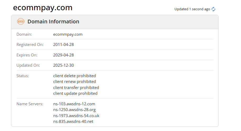 У площадки имеется лицензия Великобритании с номером 08580802 и России №2014610904. Домен сайта был зарегистрирован в 2011 году и обновлялся один раз в 2025. Регистрация EcommPay была продлена до 2029 года.
