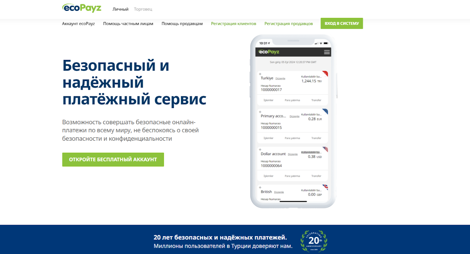 Дизайн портала ориентирован на современный цифровой стиль. Интерфейс разработан с учетом удобства пользователей и выполнения операций в мультивалютной системе. На главной странице веб-сайта нас встречают разделы «Аккаунт ecoPayz», «Помощь частным лицам», «Помощь продавцам», «Регистрация клиентов», «Регистрация продавцов».