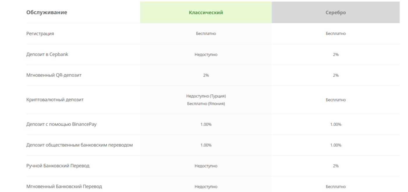 - Silver. Мгновенный QR-депозит 2%, депозит банковским переводом и BinancePay 1%, конвертация валют 5%, ручной банковский перевод 2%, депозит Cepbank 2%.