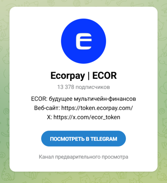 У криптокошелька Ecor Pay есть одноименное сообщество в Телеграме. Это канал, где публикуются новости и интересная информация. Вступить в сообщество могут все желающие, а на сегодня там более 13000 подписчиков. Но следует отметить, что активность пользователей достаточно низкая, так как посты просматривает мало людей.