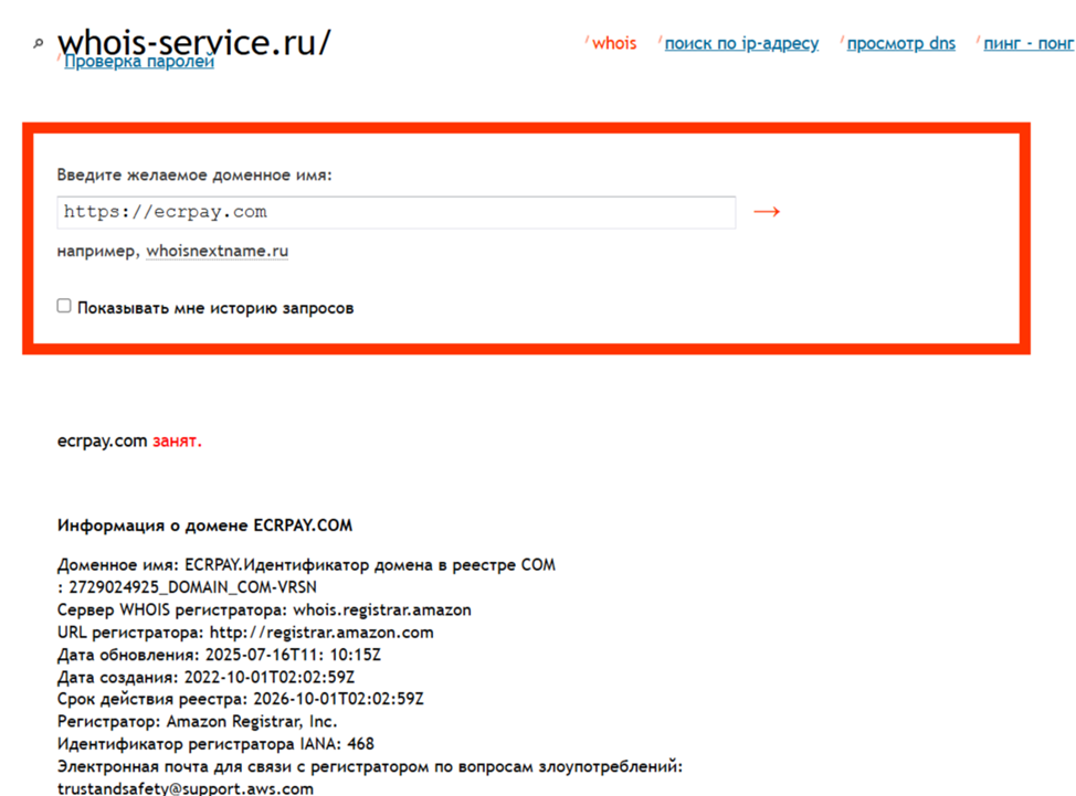 Сайт кошелька «Екорпай» работает с 2025 года. Проверка показала, что доменный адрес перешел к нему 16 июля. Значит, сервис действует совсем мало времени, и поэтому считать его надежным нельзя. Доменный адрес продлен на год. Сам домен зарегистрирован в 2022 году, но тогда он принадлежал другой конторе.