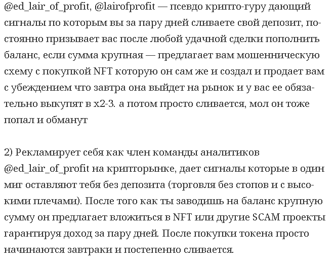 Другим источником дохода Эдуард предлагает покупку NFT, которые в течение нескольких дней должны быть выставлены на продажу и принести 200-300 процентов дохода. По отзывам пользователей, эти NFT созданы самим автором схемы и после появления в продаже остаются не ликвидными, то есть цель их выпуска – только для продажи тем, кто следует советам Ed lair of profit.Отзывы пользователей о советах Эдуарда