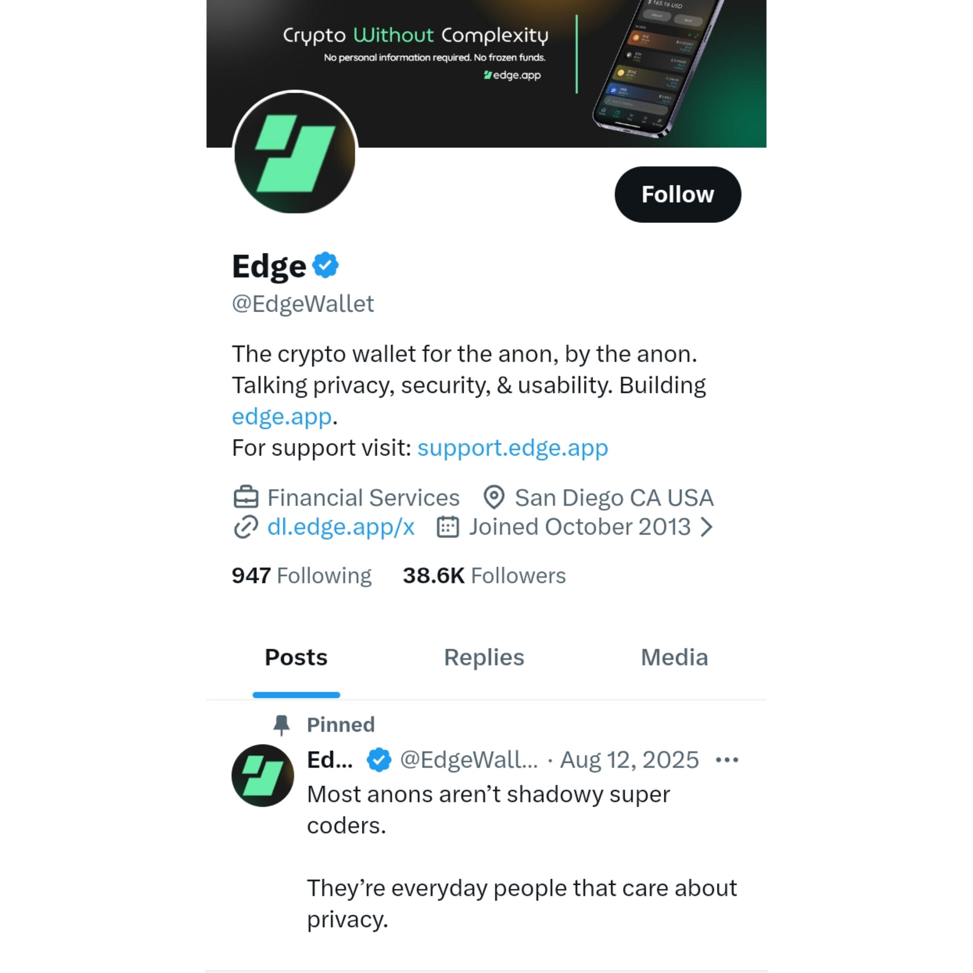 Канал в X EdgeWallet был создан в 2013 году, и на апрель 2026 года на него подписано 38k пользователей.