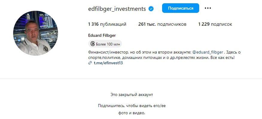 Эдуард Филбегер активно ведет свои страницы в Инстаграме и Телеграме, где у него 260 000 и 4 000 подписчиков. Он часто выкладывает посты, не связанные с трейдингом. В Телеграме он также рекламирует разные каналы, например, проект Ильи Соловея, который дает советы по деньгам.