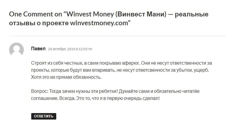 Пользователи выражают сильное разочарование относительно платформы Winvest Money, многие пишет, что зря инвестировали в этот лохотрон. Проценты с вложенных средств выплачиваются лишь тем, кто активно привлекает новых участников. Тем не менее, вопрос о возврате основного депозита не стоит, эти деньги навсегда зависают на платформе.